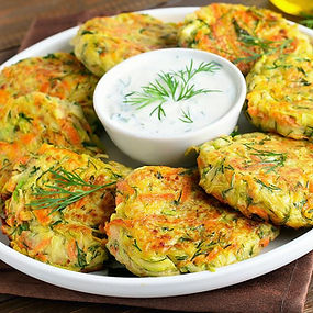 Lunch: Zucchini, carrot and potato patties with tzatziki - Salad buffet